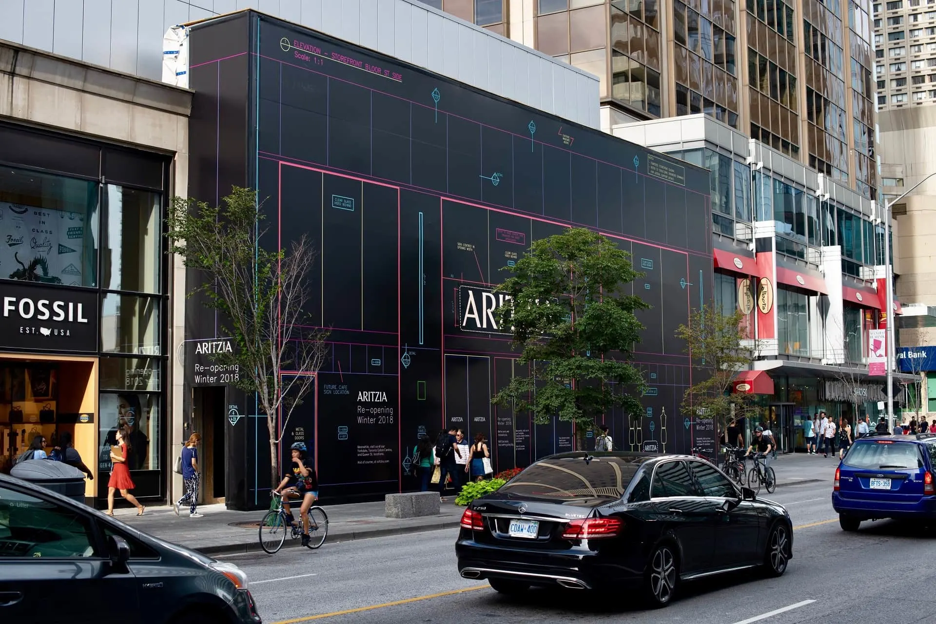 Signarama Toronto is the trusted signage partner of many big brands in Toronto when it comes to large banner installation. We have worked with brands like H&M, Vans Lifestyle, Prada, etc on many large banner installations. So When Aritzia, one of Canada’s leading retailers and women’s fashion houses needed something really special to cover their newly expanding store on Bloor Street during renovations, they selected Sign A Rama Toronto to supply and install this large and stunning printed banner.